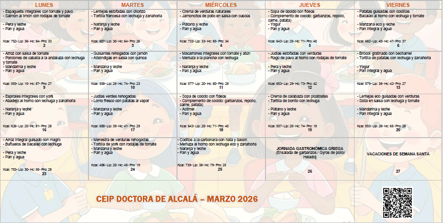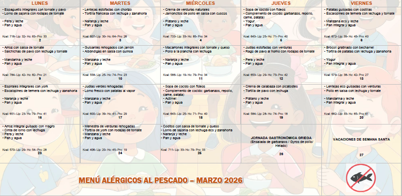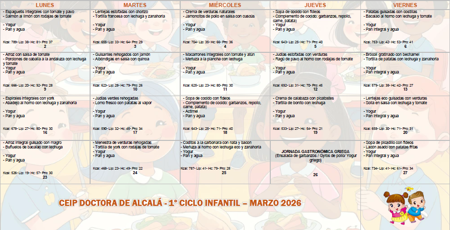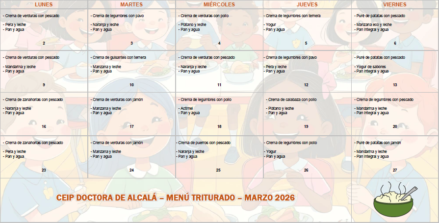 MENÚ MARZO 2026 Menú general Doctora de Alcalá Menú 1º ciclo infantil Menú pures Menú pures 0-1 Menú musulmán Menú alergicos al huevo Menú alargicos al pescado Mira el menú que va a comer tu hijo y si quieres descargalo en PDF Menú general Doctora de Alcalá Menú Intolerancias Doctora de Alcalá Menú primer ciclo de infantil Menú pures Menú purés 0-1